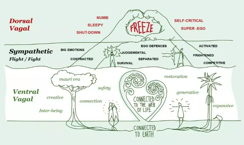 Put simply, Polyvagal Theory frames our physiology through three responses – a relational response from our essential self (ventral vagal), fight or flight response from our activated self (sympathetic), and freeze response from our numbed, overwhelmed self (dorsal vagal). All of these are intelligent and adaptive responses, and more than one can be in play in any situation.
